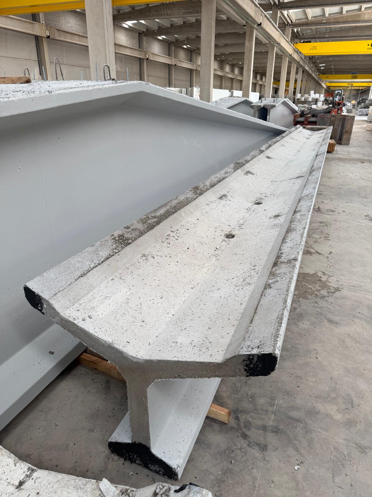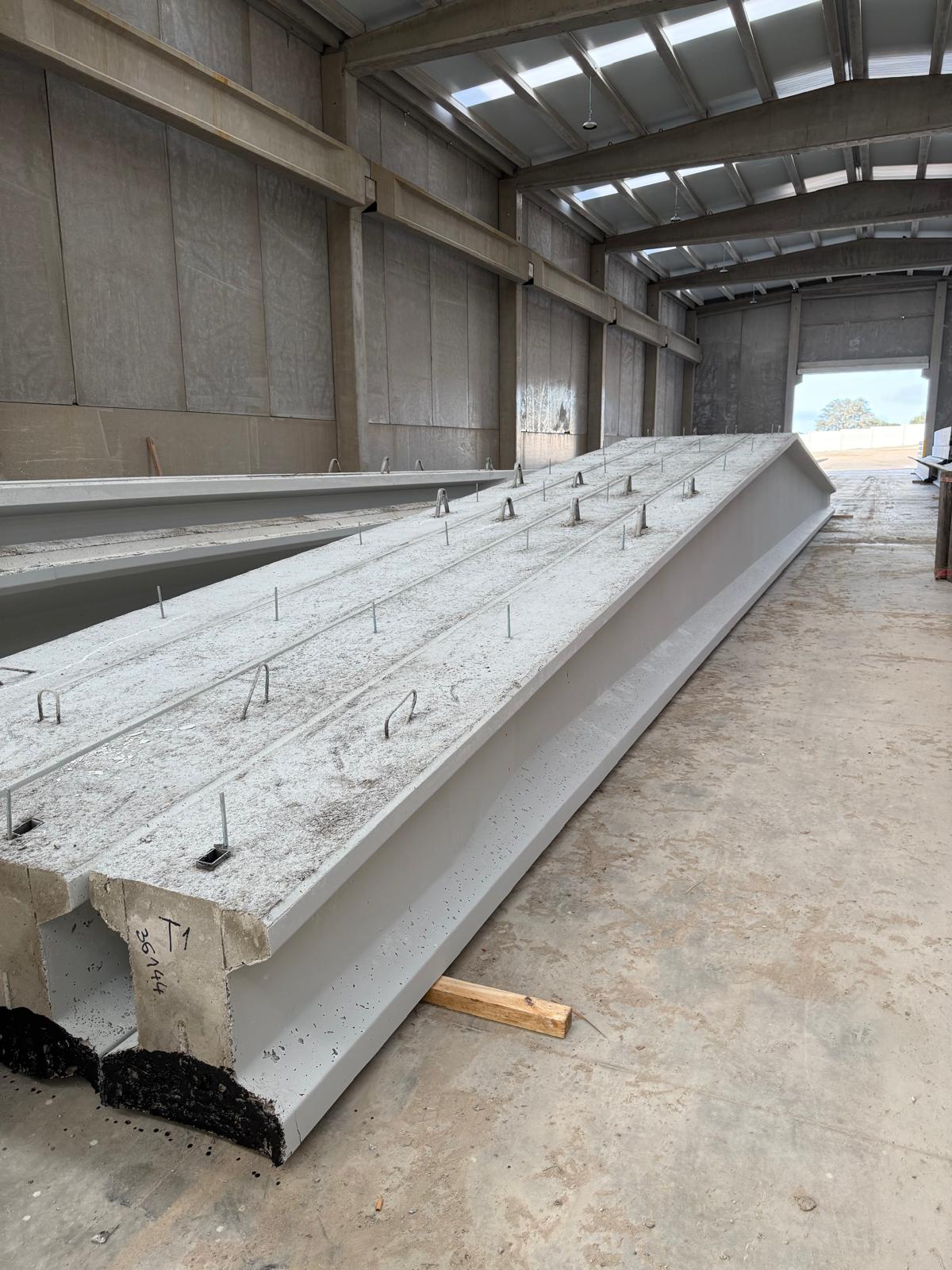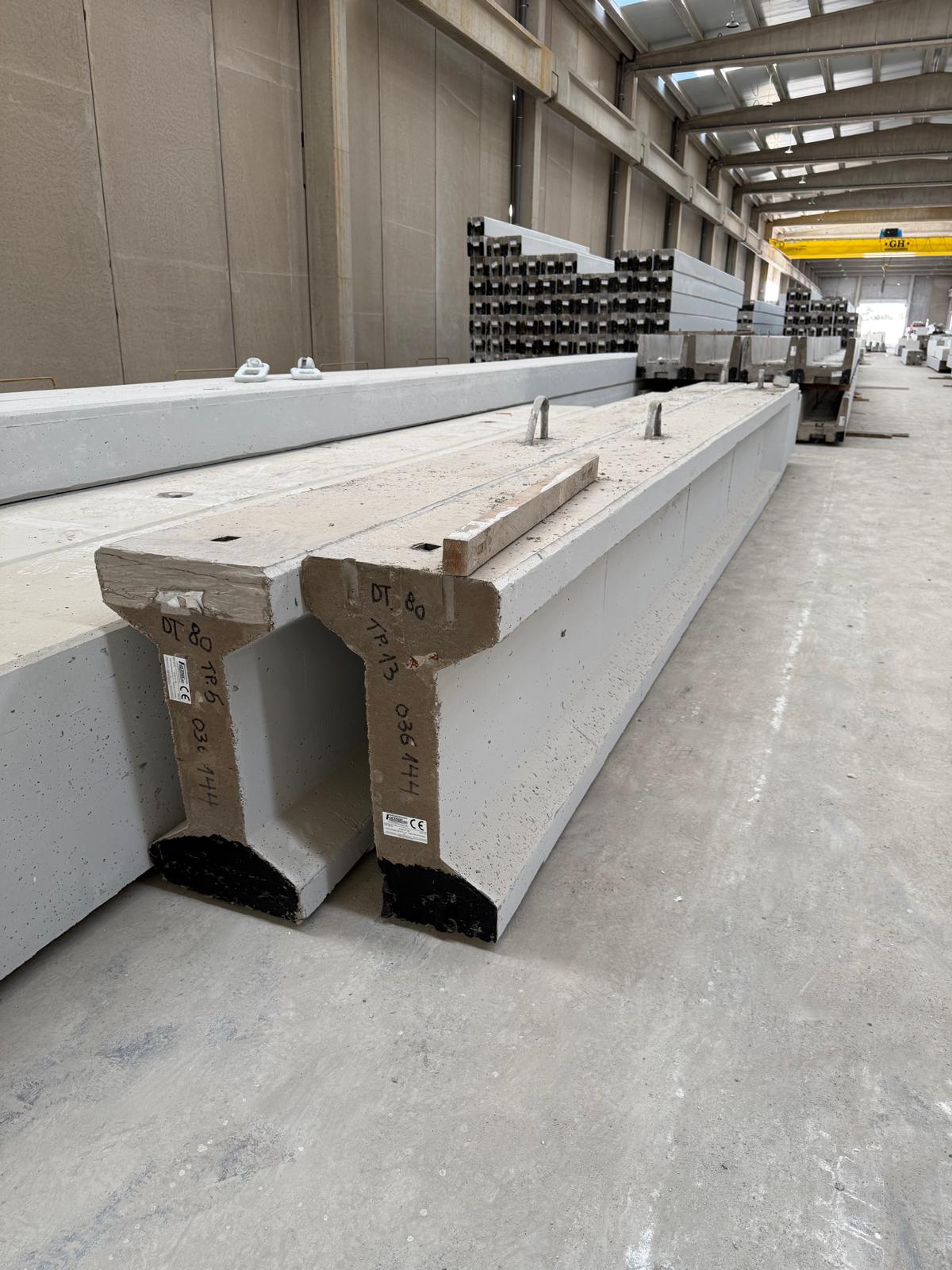 Las vigas piñón con sección en forma de “T” se utilizan en los pórticos de fachada, junto con la viga piñón cumbrera que, como resulta obvio, es la adecuada para colocarse en el caballete dado que presenta un cambio de pendiente intermedio para adaptarse a la tipología clásica de naves con faldones a dos aguas. Su pendiente es del 10%.